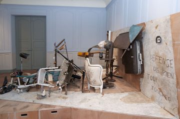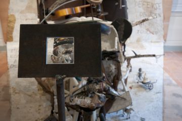 His installation, Hommage au Facteur Cheval, is emblematic of the artist’s work. A motley collection of accumulated objects, this portrait of Ferdinand Cheval in his postman’s uniform was inspired by a 1905 photograph. In the end, the two artists are quite similar, since they both collect objects. Whereas the self-taught artist in The Ideal Palace used stones, this anamorphosis is made up of chairs, guitars, Buddha heads, wheelbarrows and doll’s legs. Behind the postman stand two walls inscribed with the words: “NE RIEN ÉCRIRE LÀ-DESSUS” and “DÉFENSE DE NE RIEN TOUCHER”, which appear on the east facade and in the gallery of the Palais idéal respectively. As if to recall the identity of the naive architect, a photograph of an equine head is inscribed in a horseshoe. Further down, a little man wearing a nut for a hat pushes a wheelbarrow loaded with Michelangelo’s pietà. In a reference to the history of Western art, you can also see the back of a Venus de Milo and the she-wolf from Remus and Romulus. As in the Ideal Palace, there is a distinct lack of emptiness in the composition. We had to stand back to fully appreciate the nature of this composition, just as we sometimes have to climb the Belvedere, built by the postman Cheval in front of these Three Giants, to admire the scale of his work.