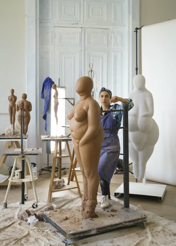 À l’extérieur des espaces d’exposition, six vénus en bronze avec peau de terre sont installées en dialogue avec le Palais. Posées sur des socles rappelant la technique locale du pisé, elles sont inspirées des Vénus paléolithiques de la période gravettienne (entre 30 000 et 20 000 ans avant notre ère) et se tiennent droites comme les gardiens du Palais.